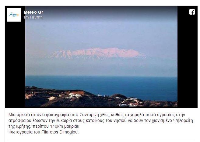 Η φωτογραφία αναδημοσιεύτηκε στα social media με το Meteo.gr, να εξηγεί πως τα χαμηλά ποσά υγρασίας στην ατμόσφαιρα ήταν ο λόγος που οι κάτοικοι του νησιού είχαν την ευκαιρία να δουν τον χιονισμένο Ψηλορείτη της Κρήτης από την Σαντορίνη.