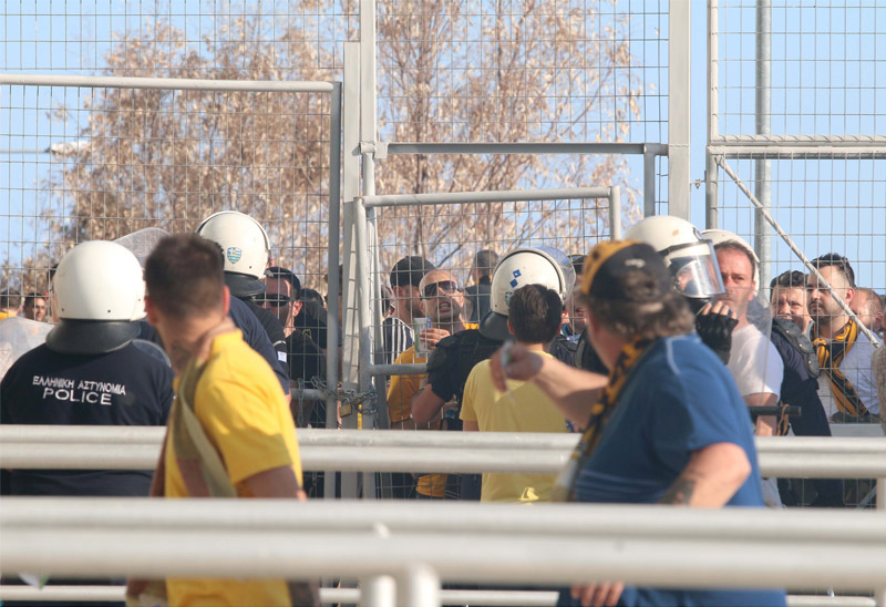 20-30 οπαδοί της ΑΕΚ επιχείρησαν να σπάσουν τον αστυνομικό κλοιό και να μπουν στο γήπεδο χωρίς εισιτήρια με αποτέλεσμα να πέσουν πολλά δακρυγόνα.