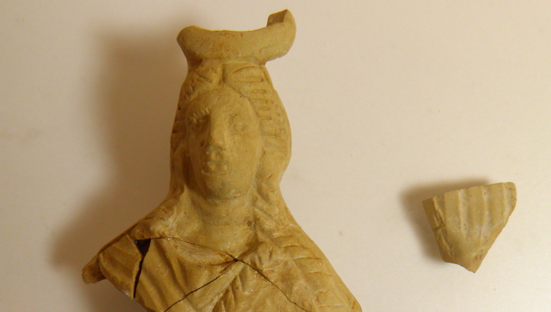 Τμήμα πήλινου ειδωλίου ή λαβής λύχνου με τη μορφή Ίσιδας από το Ιερό των Αιγυπτίων Θεών στην Μπρεξίζα Μαραθώνα
