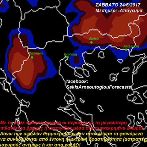 "Προσοχή! Μεγάλη πιθανότητα για καταιγίδες μετά το μεσημέρι στη βόρεια Ελλάδα που λόγω των υψηλών θερμοκρασιών ίσως είναι και έντονες! (Προγνωστικός χάρτης)"