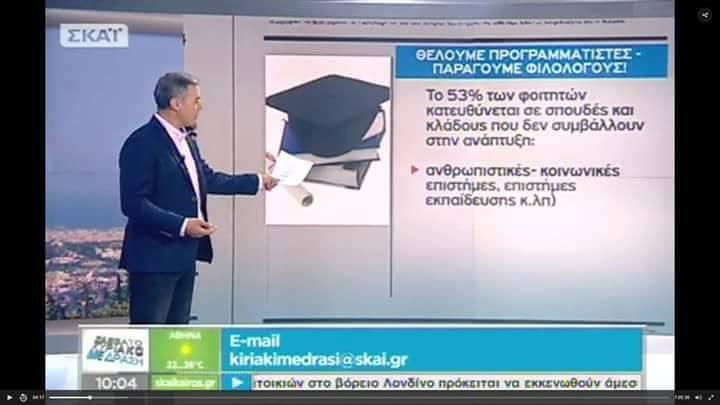 Όπως λένε και στα μέσα κοινωνικής δικτύωσης, «επιτέλους κάποιος το είπε!» Για πολύ καιρό είχαν περάσει στο απυρόβλητο όλοι οι κηφήνες των ανθρωπιστικών σπουδών. Η τηλεόραση του ΣΚΑΪ, επειδή όλοι μαζί μπορούμε και χωρίς φιλόλογους, με ένα εντυπωσιακό γράφημα έβαλε τα πράγματα στη θέση τους: 53% των φοιτητών και φοιτητριών, σπουδάζουν σε μη αναπτυξιακές σχολές. «Παραπάνω από τους μισούς δηλαδή», αναφώνησε με αστραπιαία μαθηματική αντίληψη ο δημοσιογράφος. Ποιες είναι αυτές; Μα φυσικά οι λεγόμενες ανθρωπιστικές.