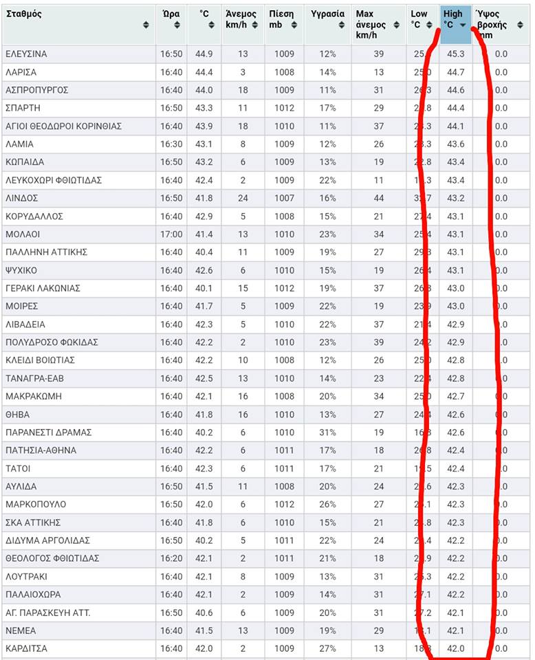 Στην υπόλοιπη Ελλάδα, σε πολλές περιοχές καταγράφηκαν θερμοκρασίες κοντά στους 43-44°C και τοπικά 45°C, που αλλού, στη Λάρισα!