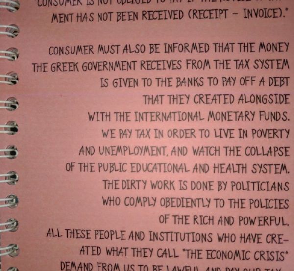 «Ο καταναλωτής πρέπει επίσης να γνωρίζει ότι τα χρήματα που η ελληνική κυβέρνηση λαμβάνει από το φορολογικό σύστημα δίνεται στις τράπεζες για να πληρώσουν ένα χρέος που οι ίδιες δημιούργησαν μαζί με το Διεθνές Νομισματικό Ταμείο…