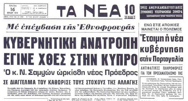 Η είδηση για το πραξικόπημα στην Κύπρο από την πρώτη σελίδα των «Νέων» στις 16 Ιουλίου 1974