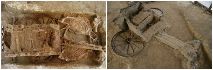 Οι πέντε άμαξες αποτελούν το πιο εντυπωσιακό εύρημα της ανασκαφής. Μαζί με τα υποζύγιά τους έχουν εναποτεθεί σε ρηχούς λάκκους, ανοιγμένους στο φυσικό έδαφος.