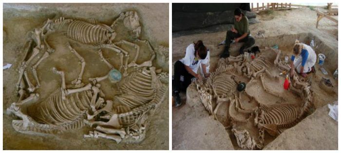 Σκελετοί από άλογα που βρέθηκαν στο εσωτερικό του τύμβου. Η ανασκαφική έρευνα ξεκίνησε το 2002 από την ΙΘ΄Εφορεία Προϊστορικών και Κλασικών Αρχαιοτήτων Θράκης