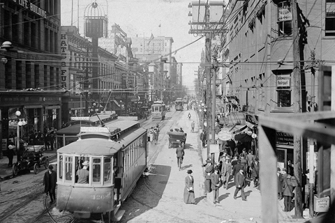 Η Yonge Street βόρεια από την King Street, το 1911, ο τόπος όπου σημειώθηκαν οι μεγαλύτερες ζημιές κατά τη διάρκεια του πογκρόμ εναντίον των Ελλήνων μεταναστών το 1918 (φωτό από τα Αρχεία της πόλης του Τορόντο).