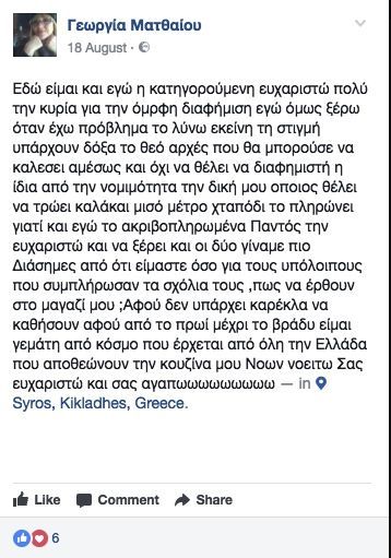 "Εδώ είμαι και εγώ η κατηγορούμενη ευχαριστώ πολύ την κυρία για την όμορφη διαφήμιση εγώ όμως ξέρω όταν έχω πρόβλημα το λύνω εκείνη τη στιγμή υπάρχουν δόξα το θεό αρχές που θα μπορούσε να καλεσει αμέσως και όχι να θέλει να διαφημιστή η ίδια από την νομιμότητα την δική μου οποιος θέλει να τρώει καλά και μισό μέτρο χταπόδι το πληρώνει γιατί και εγώ το ακριβοπληρωμένα Παντός την ευχαριστώ και να ξέρει και οι δύο γίναμε πιο Διάσημες από ότι είμαστε όσο για τους υπόλοιπους που συμπλήρωσαν τα σχόλια τους ,πως να έρθουν στο μαγαζί μου ;Αφού δεν υπάρχει καρέκλα να καθήσουν αφού από το πρωί μέχρι το βράδυ είμαι γεμάτη από κόσμο που έρχεται από όλη την Ελλάδα που αποθεώνουν την κουζίνα μου Νοων νοειτω Σας ευχαριστώ και σας αγαπωωωωωωωωω".