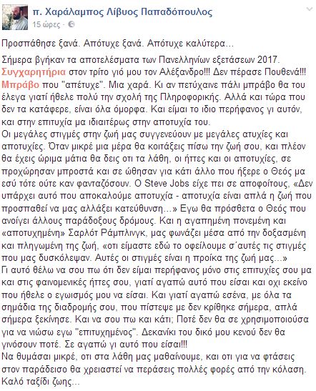 «Σήμερα βγήκαν τα αποτελέσματα των Πανελληνίων εξετάσεων 2017. Συγχαρητήρια στον τρίτο γιό μου τον Αλέξανδρο!!! Δεν πέρασε Πουθενά!!! Μπράβο που "απέτυχε". Μια χαρά. Κι αν πετύχαινε πάλι μπράβο θα του έλεγα γιατί ήθελε πολύ την σχολή της Πληροφορικής. Αλλά και τώρα που δεν τα κατάφερε, είναι όλα όμορφα. Και είμαι το ίδιο περήφανος γι αυτόν, και στην επιτυχία μα ιδιαιτέρως στην αποτυχία του.