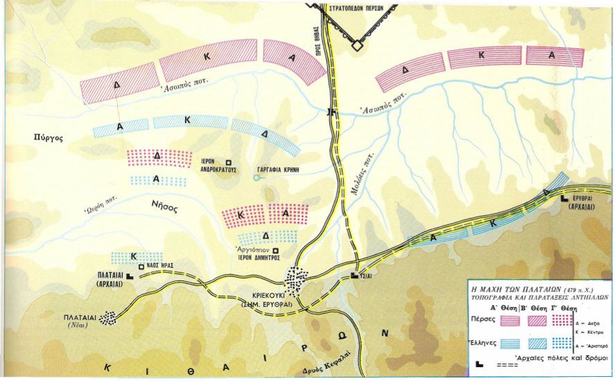 Οι Έλληνες με αρχηγό το βασιλιά της Σπάρτης Παυσανία και με την καθοριστική συμμετοχή των Αθηναίων υπό τον Αριστείδη, στην αρχή φοβήθηκαν και παρατάχθηκαν στις υπώρειες του Κιθαιρώνα. Ο Μαρδόνιος έστειλε εναντίον τους το Ιππικό του, αλλά οι Έλληνες απέκρουσαν την επίθεσή του και σκότωσαν τον αρχηγό του Μασίστιο. Το γεγονός αυτό τους έδωσε θάρρος, κατέβηκαν στην πεδιάδα κοντά στις Πλαταιές και στρατοπέδευσαν απέναντι από τους Πέρσες.