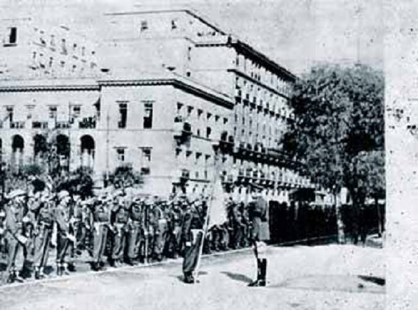Ο επικεφαλής του ελληνικού εκστρατευτικού σώματος παραλαμβάνει την πολεμική σημαία από το βασιλιά Παύλο…