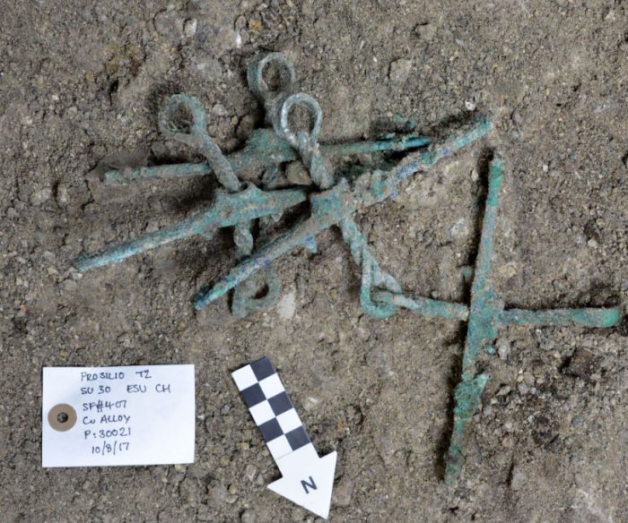 Ζεύγος στομίδων (εξαρτημάτων χαλιναριών αλόγων), όπως βρέθηκαν στην ανασκαφή