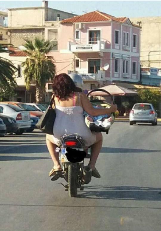 Σοκ προκαλεί η κίνηση μίας μητέρας να που κρατά το καλαθάκι με το βρέφος της, όντας συνοδηγός στο μηχανάκι που οδηγεί ο άνδρας της.