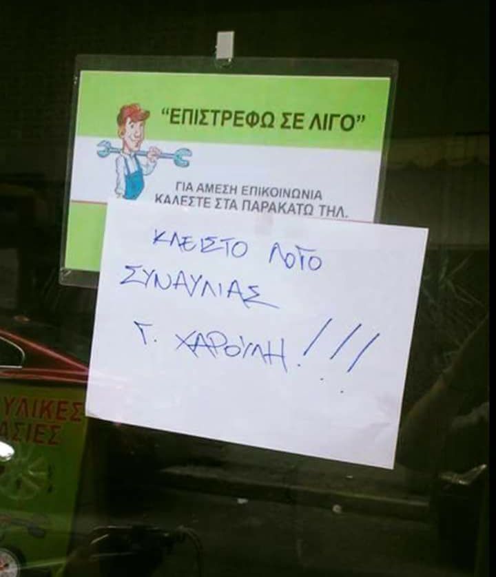 Αρχικά, ο μαγαζάτορας έβαλε μία πινακίδα η οποία έγραφε «Επιστρέφω σε λίγο», ωστόσο από ότι φαίνεται το μετάνοιωσε και κόλλησε από κάτω ένα... διευκρινιστικο σημείωμα που γράφει «Κλειστό λόγω συναυλίας Γ. Χαρούλη», έτσι ώστε να μην τον αναζητήσουν υποψήφιοι πελάτες.