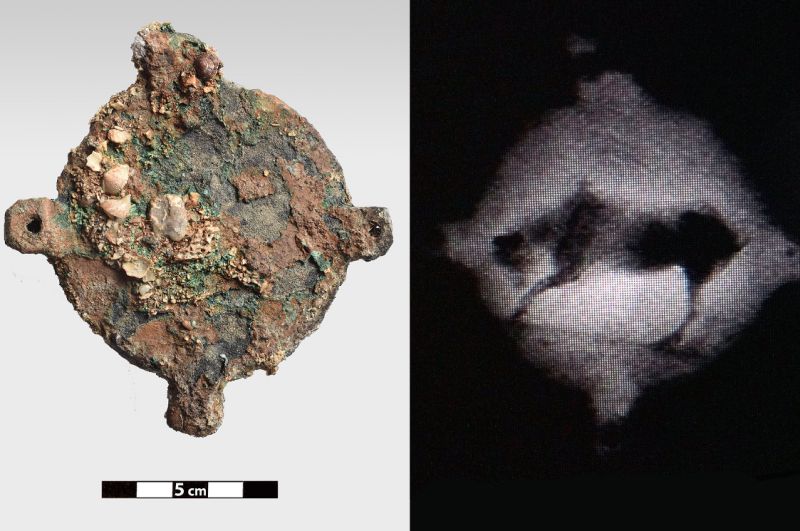 Αξιοσημείωτο είναι ότι ανάμεσα στα χάλκινα ευρήματα συγκαταλέγεται δισκοειδές αντικείμενο, πολύ οξειδωμένο, με τέσσερις διάτρητες αποφύσεις, πάνω στο οποίο, όπως έδειξε η ραδιογραφία, υπάρχει παράσταση ζώου, πιθανόν βοοειδούς.