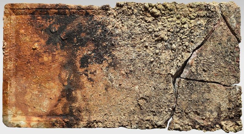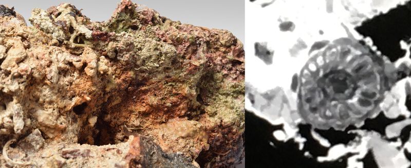 3) Συσσωμάτωμα, που δημιουργήθηκε γύρω από κάποιο σιδερένιο αντικείμενο, το οποίο έχει πλήρως οξειδωθεί και έχει αφήσει το αποτύπωμά του. Στο ίδιο συσσωμάτωμα παρατηρήθηκαν εγκλωβισμένα φύλλα μολύβδου, όστρακα και κομμάτια ξύλου. Μέσα στο συσσωμάτωμα, όπως έδειξε η ραδιογραφία, υπάρχει και μία μεσόμφαλη μεταλλική φιάλη, το είδος μετάλλου της οποίας θα φανεί μετά την απελευθέρωσή της από τον επίπαγο.
