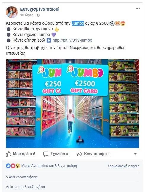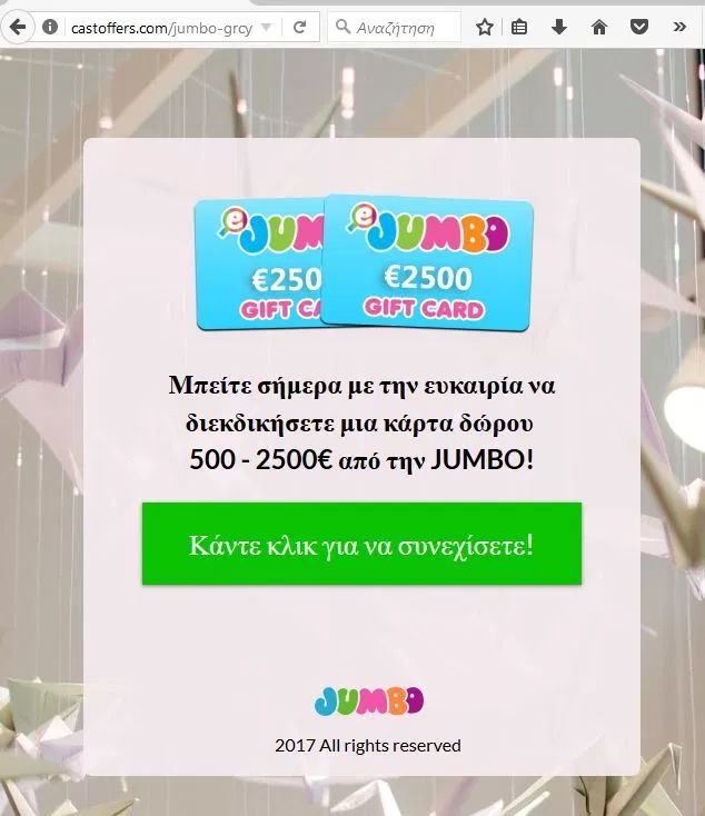 Παλιότερα είχαμε ψεύτικες δωροκάρτες από μεγάλες αλυσίδες σούπερ μάρκετ όπως «Σκλαβενίτης«, «ΑΒ Βασιλόπουλος» και «Μασούτης«. Αυτή τη φορά οι επιτήδειοι χρησιμοποιούν την εταιρία «Jumbo».