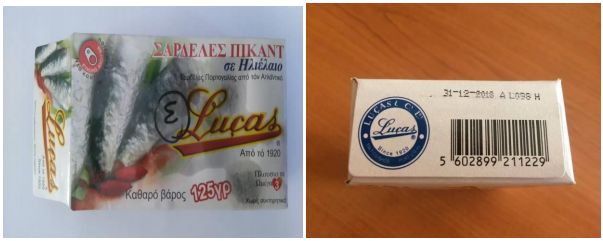 Πιο αναλυτικά, ο Ε.Φ.Ε.Τ. και η Περιφερειακή Διεύθυνση Αττικής, κατά τη διενέργεια ελέγχων και σε συνεργασία με τη Χημική Υπηρεσία Πειραιά – Τμήμα Α΄, διαπίστωσε ότι το προϊόν με την εμπορική επωνυμία «Lucas σαρδέλες πικάντικες σε ηλιέλαιο», προέλευσης Πορτογαλίας, καθαρού βάρους 125g, με ανάλωση κατά προτίμηση πριν από 31/12/2018 και αριθμό παρτίδας ΑL098H, το οποίο εισάγεται από την εταιρεία «Provinco A.E.» που βρίσκεται στη Ν. Κηφισιά, περιείχε την βιοτοξίνη ισταμίνη, σε τιμή που υπερέβαινε το ανώτατο όριο.