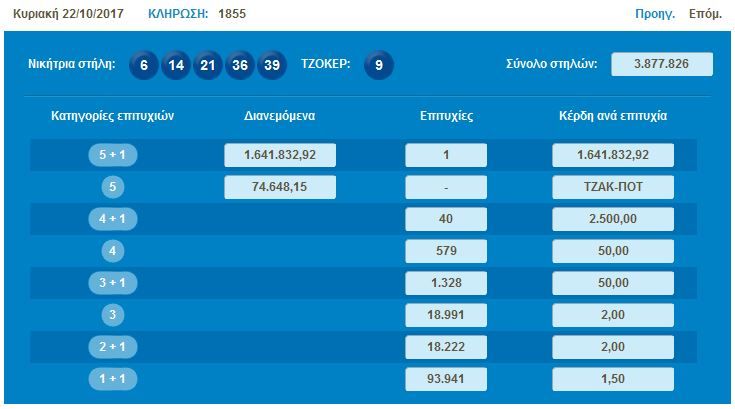 Πραγματοποιήθηκε η κλήρωση τζόκερ(1855) της Κυριακής 22/10/2017, που μοιράζει τουλάχιστον 1.641.000 στους τυχερούς της πρώτης κατηγορίας.