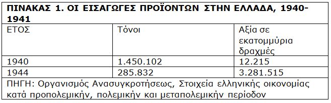 Κατά τη διάρκεια της Κατοχής οι εισαγωγές προϊόντων έχουν μειωθεί αισθητά. (πίνακας 1).