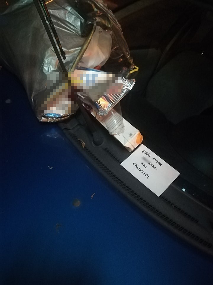 Όταν, λοιπόν, γύρισε ο οδηγός στο σημείο που είχε παρκάρει, αντίκρισε στο παρμπρίζ μία σακούλα με σκουπίδια και ένα σημείωμα.
