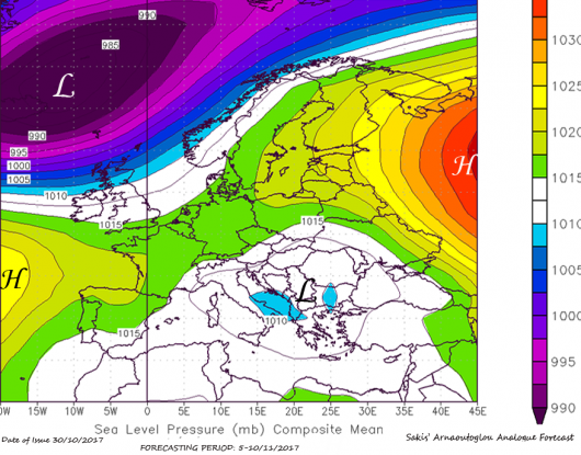 Για την περίοδο 10-20 Νοεμβρίου είναι πολύ πιθανόν το πεδίο χαμηλών πιέσεων) στα βορειοανατολικά του Ατλαντικού (μωβ και μπλε χρωματισμοί ) να επεκταθεί νοτιοανατολικότερα, μεταφέροντας στη Μεσόγειο μικρότερες-δευτερεύουσες και αβαθέστερες υφέσεις (βαρομετρικά χαμηλά) ένα ή δύο εκ των οποίων δεν αποκλείεται να περάσουν και πάνω από τη χώρας μας δίνοντας αξιόλογες βροχές κατά τόπους κυρίως στα δυτικά, κεντρικά και βόρεια με επικρατέστερους ανέμους ισχυρούς νοτιάδες να εναλλάσσονται όμως και σε βοριάδες πρόσκαιρα στα ανατολικά και βόρεια με τη θερμοκρασία πιθανώς ελαφρώς σε πιο χαμηλά για εκείνη την περίοδο επίπεδα κυρίως στα δυτικά, κεντρικά και νότια!