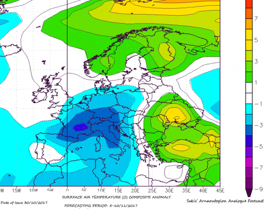 «Φίλες και φίλοι σας παραθέτω το αποτέλεσμα της εργασίας μου πάνω στην ΠΙΘΑΝΗ εξέλιξη του καιρού για τον φετινό ΝΟΕΜΒΡΗ 2017 βάσει της αναλογικής μεθόδου η οποία αποτελεί ΕΚΤΙΜΗΣΗ και βασίζεται στην μελέτη και την ανάλυση των δεικτών της Βορειοατλαντικής Ταλάντωσης ΝΑΟ, (των συσχετισμών δηλαδή της ατμοσφαιρικής πίεσης στο βόρειο ημισφαίριο μεταξύ Ισλανδίας και Αζορών), καθώς και τη σύγκριση της διάταξης των βαρομετρικών συστημάτων τα τελευταία 70 χρόνια (αυτή τη φορά συμπεριλαμβανομένων των ετών με Ελ Νίνιο) στην Ευρώπη προσπαθώντας με τον τρόπο αυτό να δώσει μια πιθανή επερχόμενη διάταξη των βαρομετρικών συστημάτων στην ανώτερη ατμόσφαιρα καθώς και την ΠΙΘΑΝΗ απόκλιση της θερμοκρασίας από τα κανονικά για την συγκεκριμένη περίοδο επίπεδα ΣΕ ΚΑΜΙΑ ΠΕΡΙΠΤΩΣΗ η παρακάτω προσπάθεια δεν αποτελεί πρόγνωση όπως αυτή γίνεται με την βοήθεια των παγκόσμιων αριθμητικών μοντέλων πρόγνωσης για τις επόμενες 5-7 ημέρες.