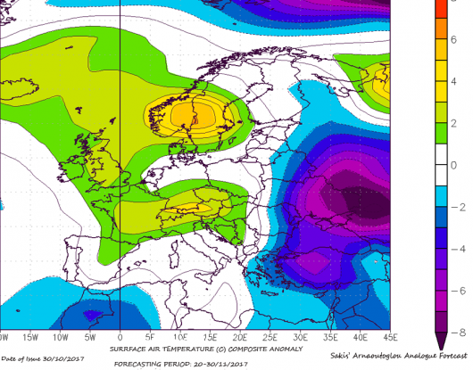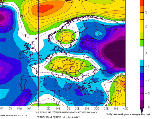 Για την περίοδο 20-30 Νοεμβρίου είναι πιθανή μια πρόσκαιρη ψυχρή εισβολή στη βόρεια και ανατολική Ελλάδα καθώς οι υψηλές πιέσεις της Ρωσίας δεν αποκλείεται να "απλώσουν τα πλοκάμια τους " και νοτιότερα. Εάν δεν υπάρξει κάποιος ιδιαίτερος συνδυασμός με χαμηλές πιέσεις απο τα δυτικά οι ψυχρές αυτές αέριες μάζες θα πρέπει να φέρουν τοπικά φαινόμενα ακόμα και με τη μορφή χιονιού ακόμα και σε σχετικά χαμηλά υψόμετρα της βόρειας και ανατολικής ηπειρωτικής Ελλάδας ενώ οι ψυχροί βοριάδες θα πρέπει να ρίξουν και αισθητά τη θερμοκρασία στην βόρεια και την ανατολική Ελλάδα. Για να δούμε τι ψάρια θα πιάσει κι αυτή τη φορά! Για ότι νεότερο σχετικά με τον καιρό καθημερινά, φυσικά και σας περιμένω στην μεγαλύτερη μετεο-παρέα του διαδικτύου».