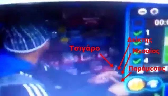 - Ο μετανάστης δεν χρησιμοποιεί το μεσαίο δάκτυλο αλλά τον παράμεσο, πιθανότατα για να δείξει αυτό που κρατάει στο άλλο χέρι.