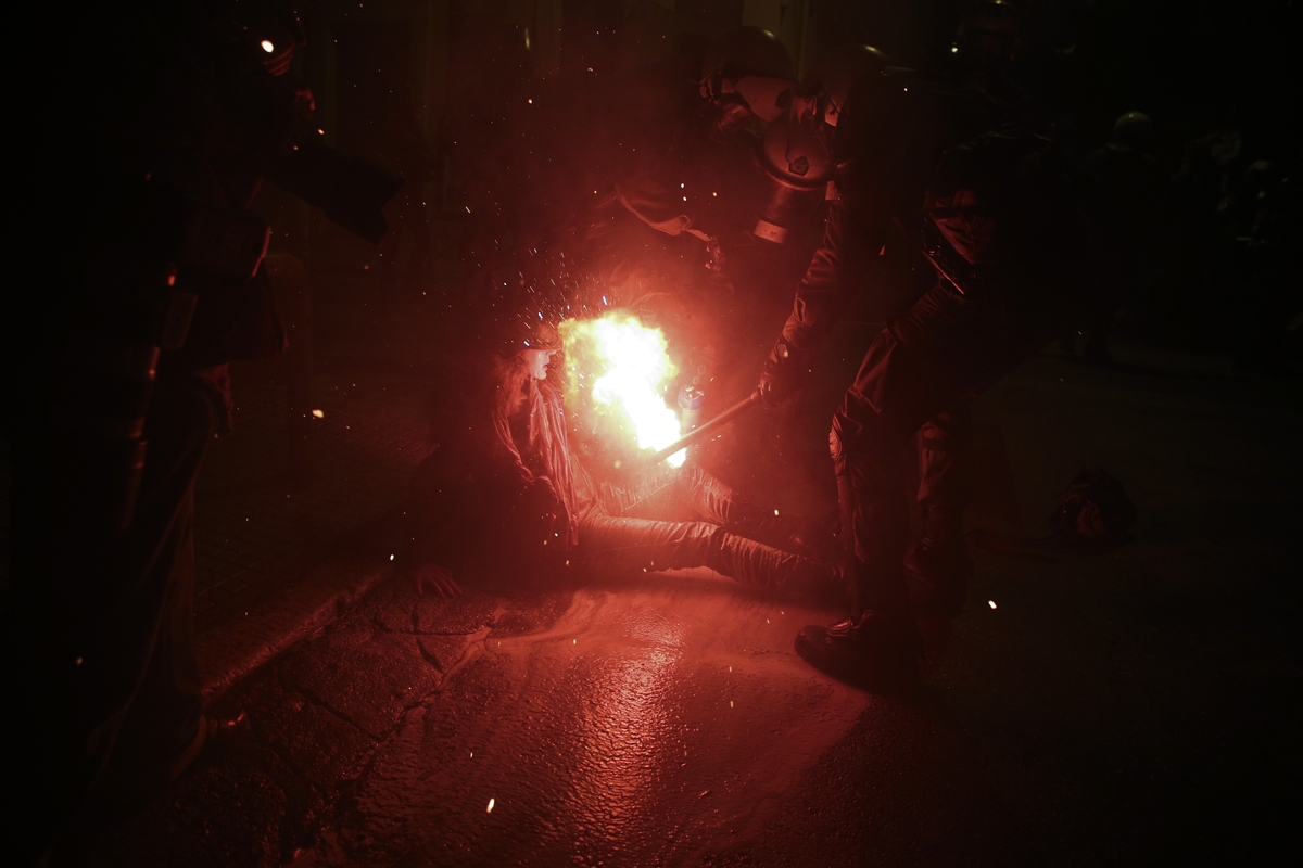 Οι άντρες των ΜΑΤ έκαναν προσπάθειες να σβήσουν τη φωτοβολίδα η οποία φαίνεται ότι ήταν ναυτική και δεν έσβηνε, στο τέλος έσβησε μόνη της στο πόδι της άτυχης δικηγόρου.