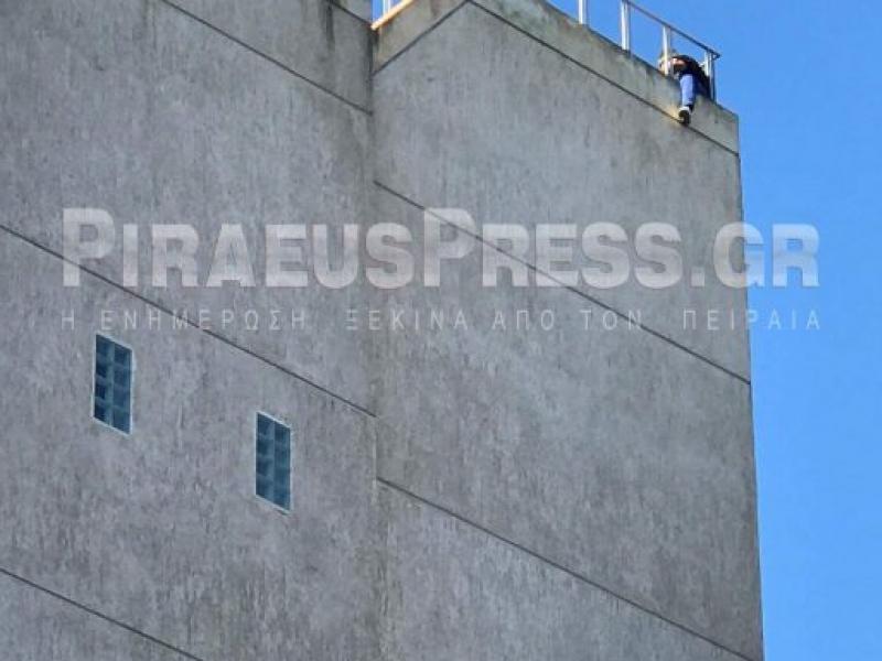Όπως φαίνεται στις εικόνες του Piraeuspress.gr, ο άνδρας κάθεται στο περβάζι και απειλεί να πέσει, για άγνωστες μέχρι στιγμής αιτίες.