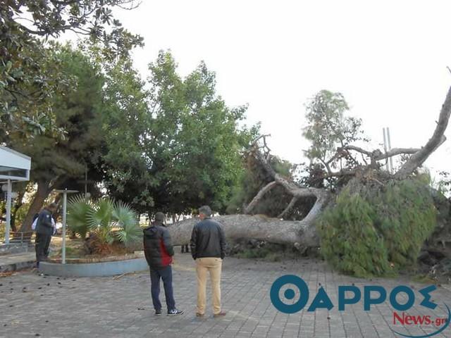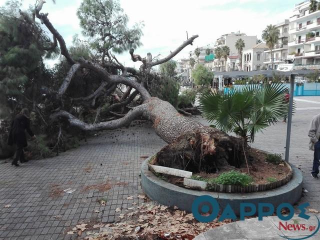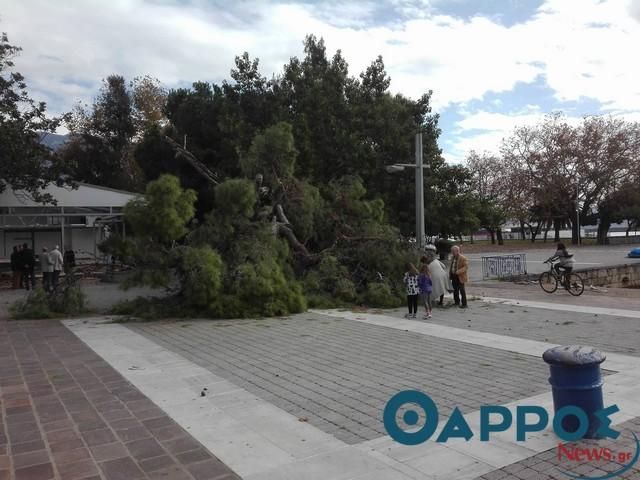 «Σωριασμένο» στο έδαφος αντίκρισαν το πρωί της Κυριακής (10-12-2017) περαστικοί και κάτοικοι της παραλίας το υπεραιωνόβιο πεύκο που «δέσποζε» με την παρουσία του στο «Πανελλήνιον». Από καθαρή τύχη κανείς δεν βρισκόταν στο σημείο την ώρα που έπεσε το πεύκο καθώς πρόκειται για ένα σημείο πολυσύχναστο που καθημερινά εκατοντάδες Καλαματιανοί πραγματοποιούν τη βόλτα τους.