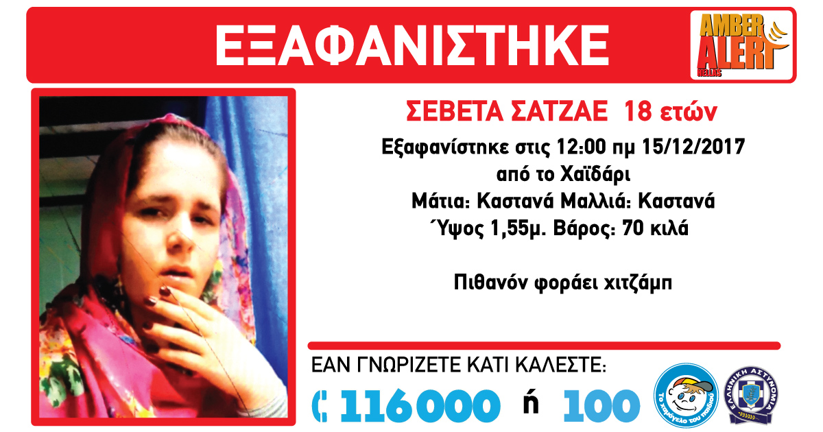 Πρόκειται για την Σεβετά Σατζαέ, 18 ετών, τα ίχνη της οποίας χάθηκαν στις 15/12/2017 , στις 12:00.