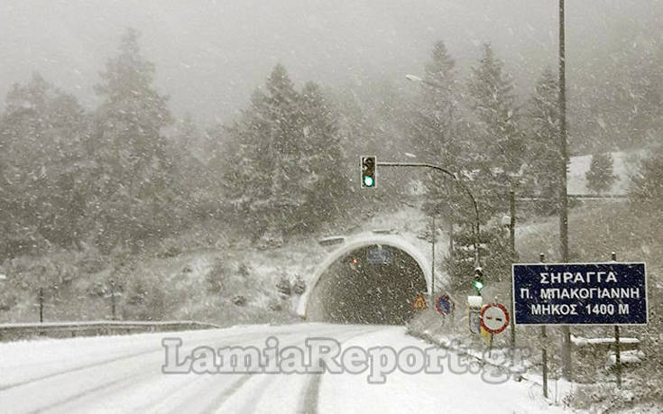 Οι εικόνες από τη σήραγγα «Παύλος Μπακογιάννης» είναι ενδεικτικές για τη χιονόπτωση που επικρατεί στο ορεινό κομμάτι του δήμου.