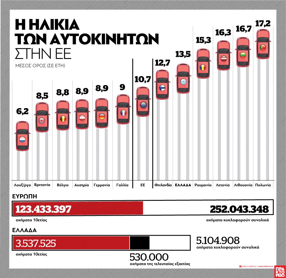 Αναλύοντας την ηλικία των αυτοκινήτων στην Ελλάδα, τα αυτοκίνητα άνω της 10ετίας είναι 3.537.525 από τα συνολικά 5.104.908 οχήματα που κυκλοφορούν, με περίπου 530.000 εξ αυτών να είναι της τελευταίας εξαετίας.