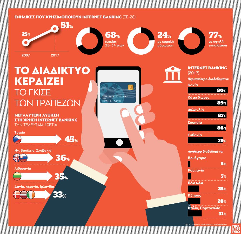 Τα χαμηλότερα μερίδια καταγράφηκαν στη Βουλγαρία (5%) και στη Ρουμανία (7%). Λιγότερο από 30% των ατόμων μεταξύ 16 και 74 ετών χρησιμοποιούν την τραπεζική μέσω Διαδικτύου ήταν στην Ελλάδα (25%) και στην Κύπρο (28%).