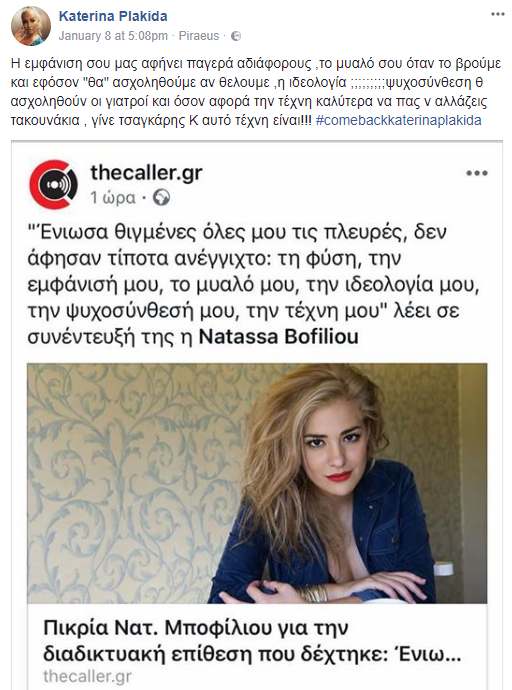 Όπως φαίνεται από παλαιότερες αναρτήσεις της κας Πλακίδα, είναι φανερή η "συμπάθεία" της προς τους πρόσφυγες, την αριστερά και η συμπάθειά της προς εθνικιστικά, ή νεοναζιστικά μορφώματα όπως η Χρυσή αυγή