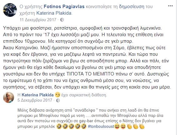 Όπως αποκαλύπτουν διάφορα ΜΜΕ, ο αστυνομικός σήμερα δέχεται μήνυση από την Κατερίνα Πλακίδα, λιμενικό γιατί την αποκάλεσε «ρατσίστρια, φασίστρια, ομοφοβική και τρανσφοβική»