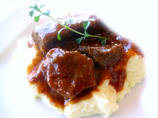 Προετοιμασία: Το καλό είναι ότι το κρέας γίνεται καλύτερο αν προετοιμαστεί την προηγουμένη γιατί δένει η γεύση. Για το κοκκινιστό υπολογίστε συνολικά γύρω στη 1 ½ ώρα και για τον πουρέ που μπορεί να γίνεται ταυτόχρονα, περί την 1 ώρα. Σύνθετη συνταγή που απαιτεί και μια σχετική επιμέλεια, αλλά με μαγικό αποτέλεσμα που αξίζει τον κόπο. Αν την κάνετε πρώτη φορά, ακολουθήστε τα βήματα και τις σημειώσεις.