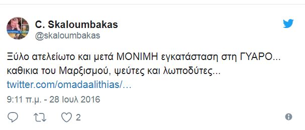 Ο χουντικός γιος του βασανιστή Σκαλούμπακα δίνει τα εύσημα του μέσω του twitter στον Μίκη Θεοδωράκη ο οποίος παρευρέθηκε σήμερα στο συλλαλητήριο για την ονομασία των Σκοπίων