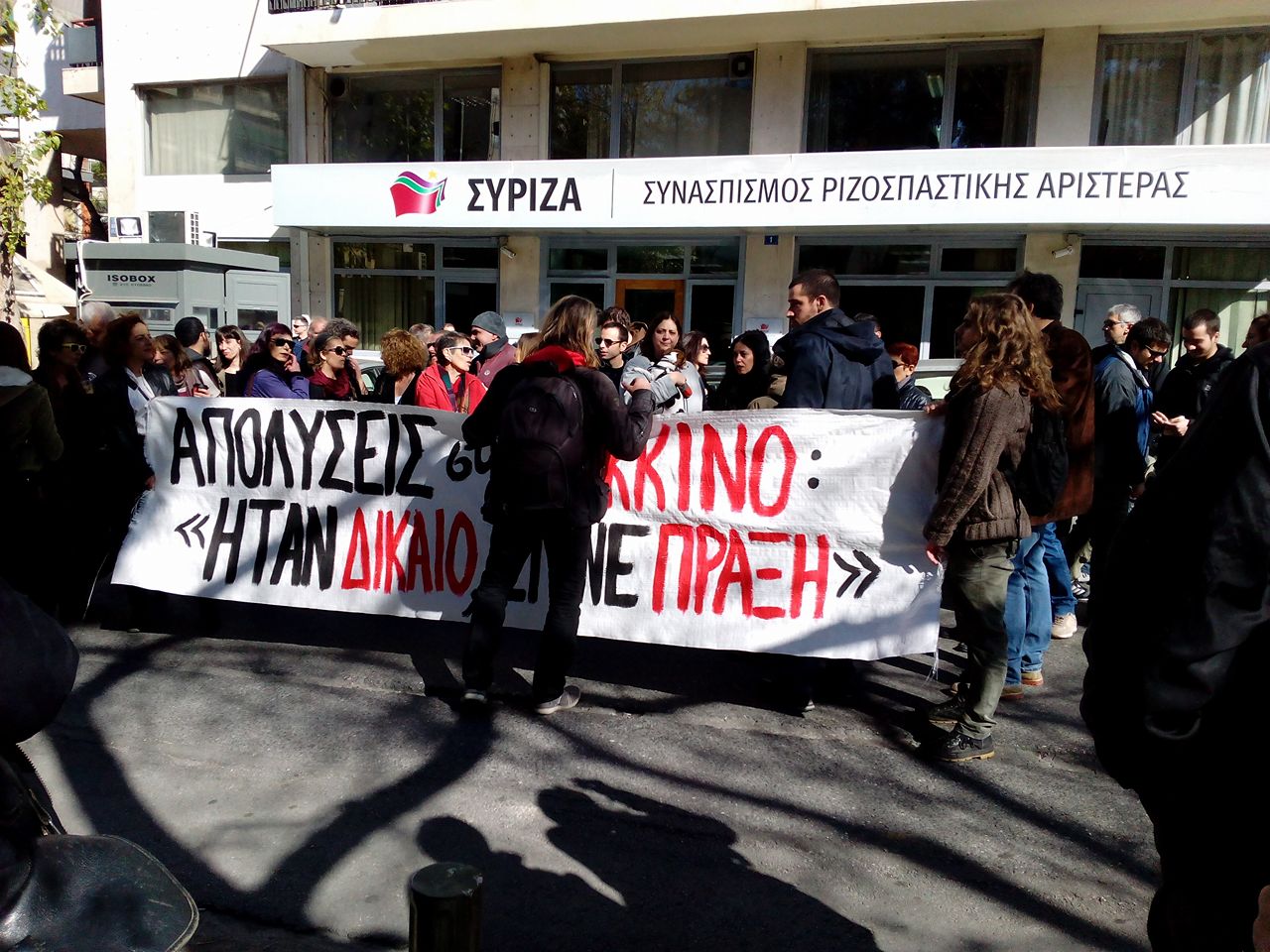 Ανάμεσα στα συνθήματα των συγκεντρωμένων, οι οποίοι αποχώρησαν χωρίς να συναντηθούν με τον γραμματέα της Κεντρικής Επιτροπής του ΣΥΡΙΖΑ, Παν. Ρήγα, όπως αναμενόταν αρχικά, ήταν το «Δεν θέλουμε δουλειά, δεν θέλουμε μισθό, θέλουμε τον Τσίπρα ξανά πρωθυπουργό», καθώς και το «Μέσα στην κρίση ο ΣΥΡΙΖΑ έχει λύσεις, 10, 100, χιλιάδες απολύσεις».