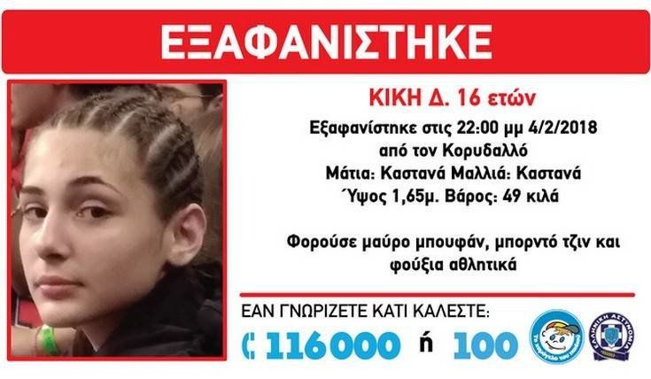 Σύμφωνα με το Χαμόγελο του Παιδιού: “Στις 04/02/2018 στις 22:00, εξαφανίστηκε από τον Κορυδαλλό, η Κική Δ. 16 ετών. Για την εξαφάνιση της ανήλικης ενημερωθήκαμε από την οικογένειά της, σήμερα 12/02/2018 απογευματινές ώρες. Η Κική Δ. έχει ύψος 1,65 m, είναι 49 kg έχει καστανά μαλλιά και καστανά μάτια. Φορούσε μαύρο μπουφάν, μπορντό παντελόνι και φούξια αθλητικά παπούτσια.
