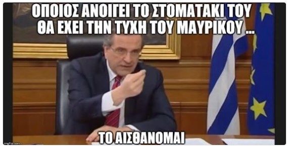 Μετά την κυκλοφορία του Documento της Κυριακής που αποκάλυπτε πως στο σκάνδαλο της Novartis, υπάρχουν τρεις νεκροί και η υπόθεση αρχίζει να θυμίζει NOOR 1, αναγνώστης μου έστειλε φωτογραφία στην οποία εμφανίζει το Σαμαρά να λέει «όποιος ανοίγει το στοματάκι του θα έχει την τύχη του Μαυρίκου. Το αισθάνομαι». Η φωτογραφία είναι από το βίντεο της προεκλογικής συνέντευξης του Σαμαρά όπου είχε πει το γνωστό «ο ΣΥΡΙΖΑ θα χάσει το αισθάνομαι».