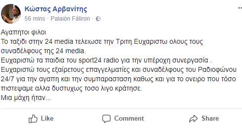 Με μια ανακοίνωση που ανέβασε στο προφίλ του στο facebook, ο -πρώην πλέον- διευθυντής του Ραδιοφώνου 24/7 88.6 Κώστας Αρβανίτης δήλωσε πως χθες τελείωσε η συνεργασία του με την 24 Media.
