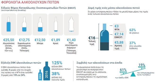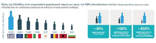 Σύμφωνα με στοιχεία που παρουσίασε η Ένωση Επιχειρήσεων Αλκοολούχων Ποτών (ΕΝΕΑΠ) η Ελλάδα έχει την υψηλότερη φορολογία στην Ευρώπη σε σχέση με το κατά κεφαλήν εισόδημα. Συγκεκριμένα ο Ειδικός Φόρος Κατανάλωσης Οινοπνευματωδών Ποτών διαμορφώνεται στην χώρα μας σε 25,5 ευρώ ανά λίτρο αιθυλικής αλκοόλης για τα αλκοολούχα και είναι 40% υψηλότερος από τον μέσο όρο της Ευρωπαϊκής Ένωσης, 100% πάνω από ανταγωνιστικές ευρωπαϊκές χώρες και περίπου 450% σε σχέση με την γειτονική Βουλγαρία.