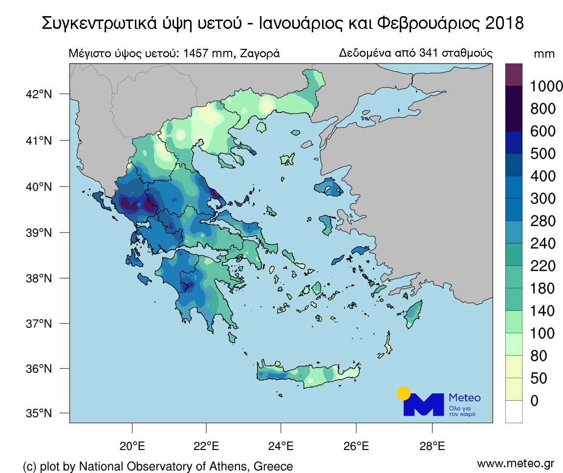 Τα μεγαλύτερα ύψη παρατηρήθηκαν στο Αν. Πήλιο και στα ορεινά της Ηπείρου, με 1.457 mm στη Ζαγορά και 954 mm στα Θεοδώριανα Άρτας αντίστοιχα. Ακόμη 9 μετεωρολογικοί σταθμοί στην Ήπειρο, την Πελ/νησο και το Άγιο Όρος κατέγραψαν πάνω από 600 mm τους τελευταίους δύο μήνες, τιμή αρκετά υψηλότερη από την μέση τιμή των τελευταίων 10 περίπου ετών. Στον παρακάτω χάρτη (Εικόνα 1) θα δείτε το συνολικό ύψος υετού σε χιλιοστά που κατέγραψαν 341 μετεωρολογικοί σταθμοί τον Ιανουάριο και Φεβρουάριο 2018 στην Ελλάδα.
