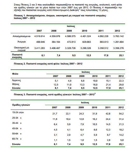 Οι άνεργοι αυξήθηκαν κατά 377.991 άτομα σε σχέση με τον Ιούλιο του 2011 (αύξηση 42,8%) και κατά 23.255 άτομα σε σχέση με τον Ιούνιο του 2012 (αύξηση 1,9%). Οι οικονομικά μη ενεργοί, δηλαδή τα άτομα που δεν εργάζονται ούτε αναζητούν εργασία, μειώθηκαν κατά 2.236 άτομα σε σχέση με τον Ιούλιο του 2011 (μείωση 0,1%) και κατά 3.406 άτομα σε σχέση με τον Ιούνιο του 2012 (μείωση 0,1%).