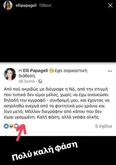 Όμως το μοντέλο επιστρέφει στο ζήτημα με ανάρτηση που έκανε στα social media: «Από πού ακριβώς με διέγραψε η ΝΔ, από την στιγμή που τυπικά δεν είμαι μέλος, χωρίς να έχω ανανεώσει δηλαδή την εγγραφή- συνδρομή μου, και έχοντας να ασχοληθώ ενεργά από τα φοιτητικά μου χρόνια και λίγο μετά; Μάλλον διεγράφην από κάπου που δεν είμαι γραμμένη. Καλή φάση, αλλά γκάφα ολκής» έγραψε στα social media το πρώην μέλος της ΟΝΝΕΔ.