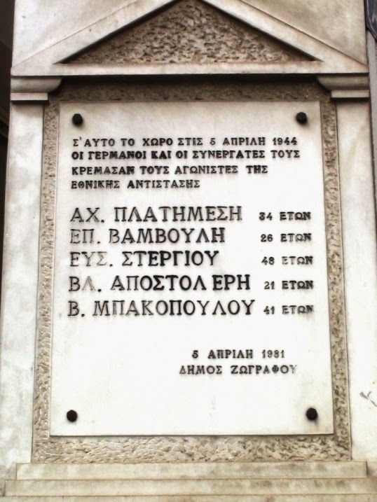 Οι Κομματικές Οργανώσεις του ΚΚΕ Ζωγράφου και Καισαριανής και τα Παραρτήματα Ζωγράφου και Καισαριανής της Πανελλήνιας Ένωσης Αγωνιστών Εθνικής Αντίστασης και Δημοκρατικού Στρατού Ελλάδος συνδιοργανώνουν εκδήλωση τιμής και μνήμης την Κυριακή 9 Απρίλη στην Πλατεία των Πέντε Ηρώων, στις 11.00 το πρωί, στον ίδιο χώρο όπου οι Γερμανοτσολιάδες κρέμασαν τους Πέντε κομμουνιστές αγωνιστές της Εθνικής Αντίστασης, στη συμβολή των οδών Παπαδιαμαντοπούλου – Ξενίας και Μικράς Ασίας.