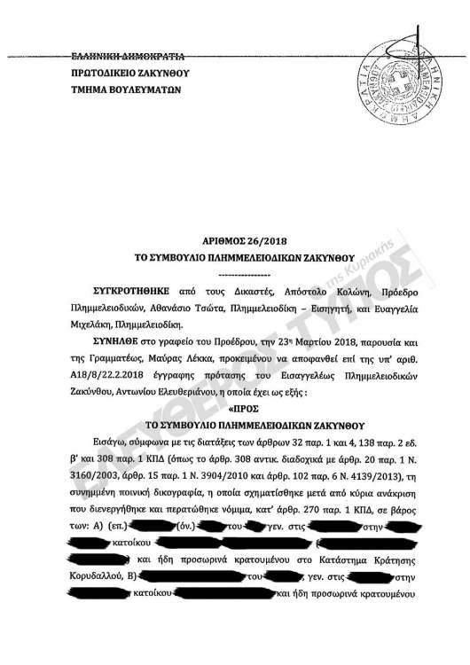 Το Συμβούλιο Πλημμελειοδικών Ζακύνθου ζητεί για τους κατηγορούμενους «να δικαστούν ως υπαίτιοι του ότι στον Λαγανά Ζακύνθου στις 7/7/2017 (έξι από αυτούς) ενεργώντας από κοινού κατόπιν συναπόφασης μεταξύ τους καθώς και με άλλο αγνώστων στην ανάκριση στοιχείων πρόσωπο με πρόθεση σκότωσαν άλλον, την πράξη τους δε αυτή αποφάσισαν και εκτέλεσαν ευρισκόμενοι σε ήρεμη ψυχική κατάσταση.